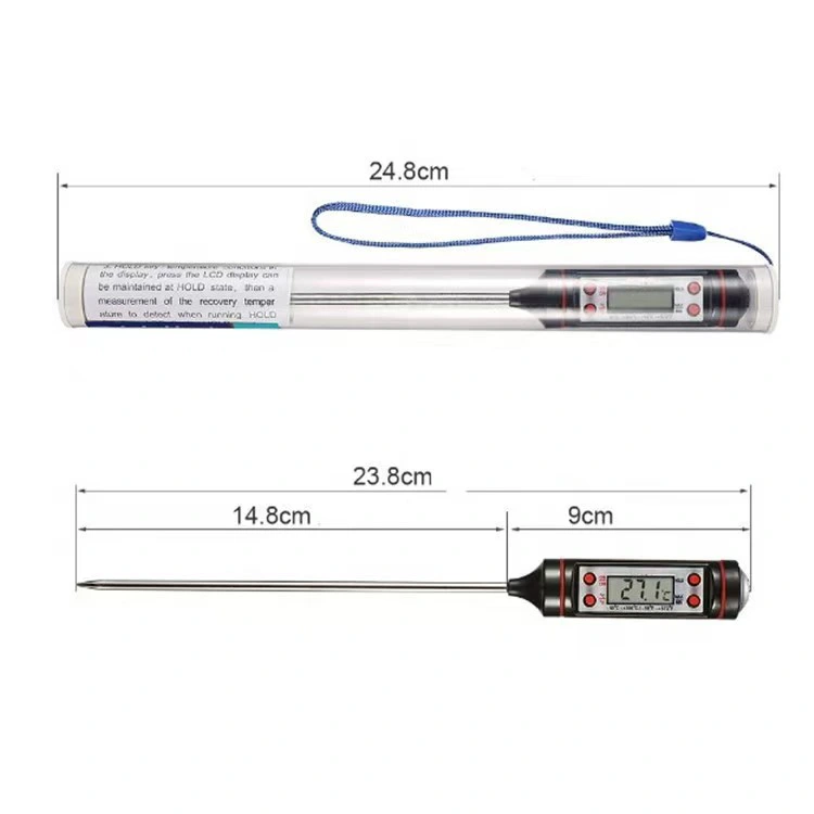 Naš termometer za hrano za kuhinjo in žar ima številne izjemne lastnosti in prednosti pri delovanju, zaradi česar izstopa na trgu. Prvič, ima strukturo v obliki peresa, ki je kompaktna, lahka in enostavna za prenašanje in shranjevanje, primerna tako za domačo uporabo kot za žar na prostem. Drugič, sonda je v celoti izdelana iz nerjavečega jekla – ta material ima odlično odpornost proti koroziji, visoko temperaturno odpornost in vzdržljivost, ni ga enostavno rjaveti, deformirati ali poškodovati in je enostaven za čiščenje, kar zagotavlja varnost hrane in dolgo življenjsko dobo. Tretjič, ima visoko natančnost in hitro merjenje temperature, ki se lahko hitro odzove na temperaturne spremembe in zagotovi natančne temperaturne vrednosti ter se izogne ​​napakam, ki jih povzroči počasno merjenje temperature. Četrtič, ima bogate funkcije: poleg pretvorbe Celzij/Fahrenheit ima široko merilno območje od -50 ℃ do +300 ℃, kar je primerno za hlajenje, ogrevanje, domačo kuhinjo, izdelavo sveč in druge scenarije. Petič, opremljen je z LCD zaslonom, ki ima prednosti velikega obsega merjenja, visoke stabilnosti in jasnega branja, kar izboljšuje uporabniško izkušnjo. Te prednosti zagotavljajo, da lahko termometer z visoko kakovostjo izpolnjuje potrebe po merjenju temperature v različnih scenarijih.